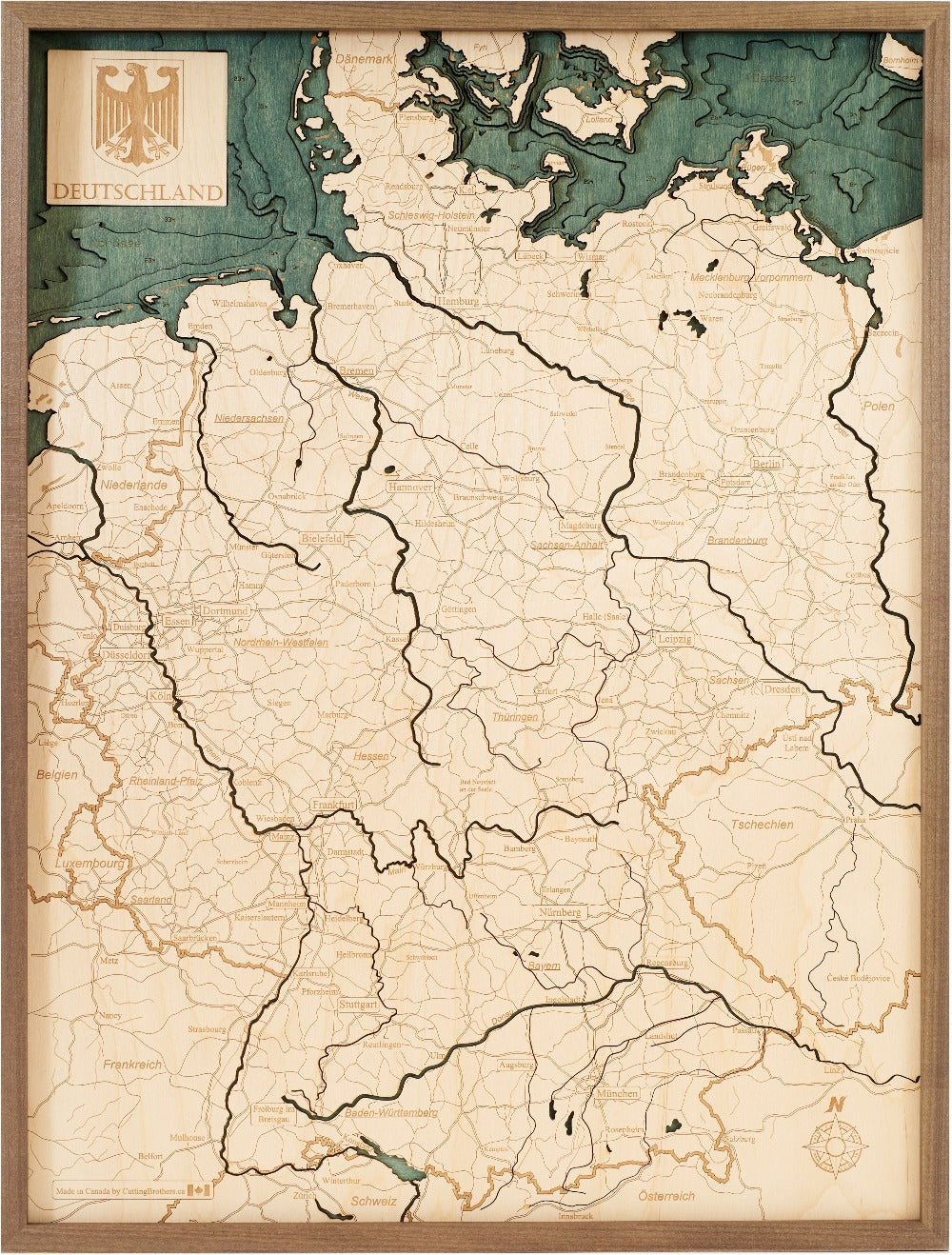 Jede Karte ist ein Kunstwerk für sich, das mit Hingabe und Sorgfalt in aufwendiger Handarbeit eingefärbt und zusammengesetzt wird. Die 3D-Wandkarten sind Ausdruck echter Handwerkskunst, denn sie werden mit Leidenschaft und Expertise in Kanada aus nachhaltigem kanadischem Holz gefertigt.