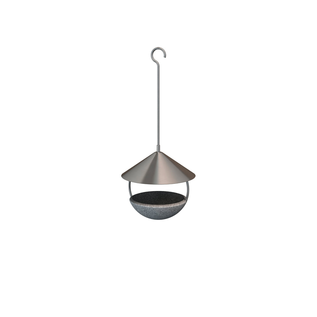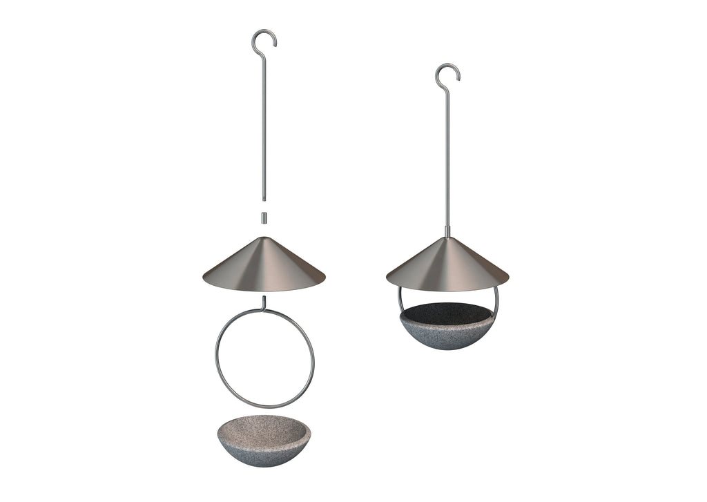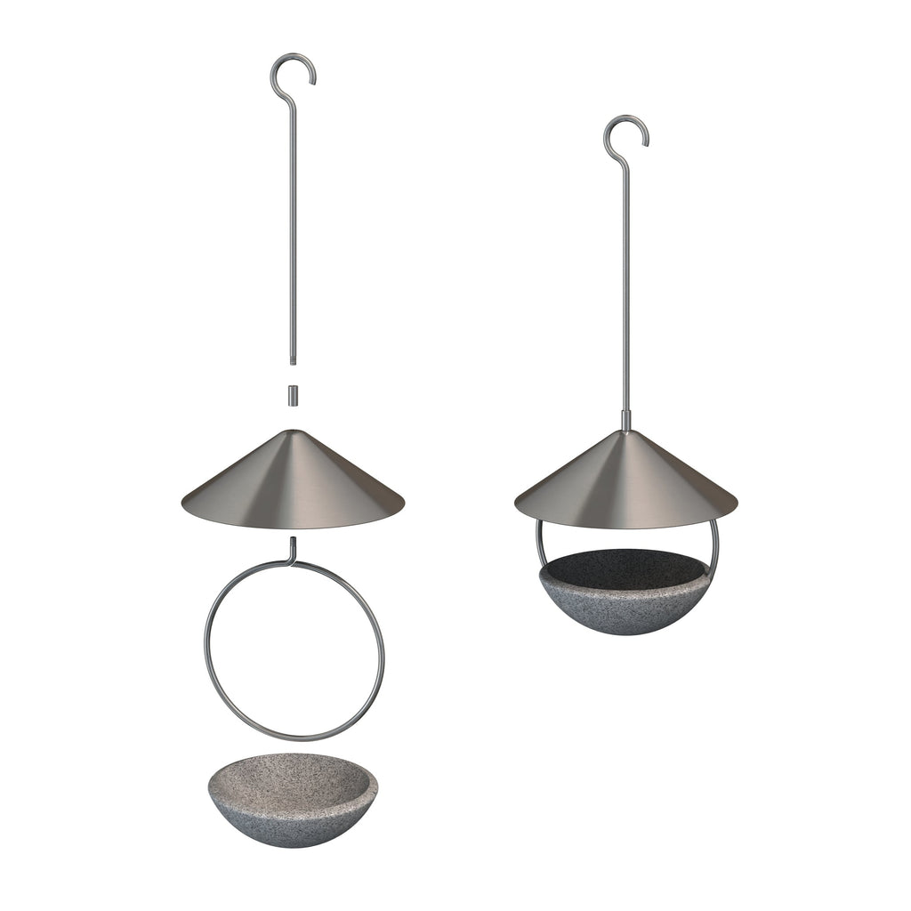 Das Futterhaus wird ohne Werkzeug aufgebaut. Die Keramikschale hängt stabil in einem Edelstahlring – windfest und sicher. Die Hängung lässt sich mit Seil oder Kette flexibel anpassen.