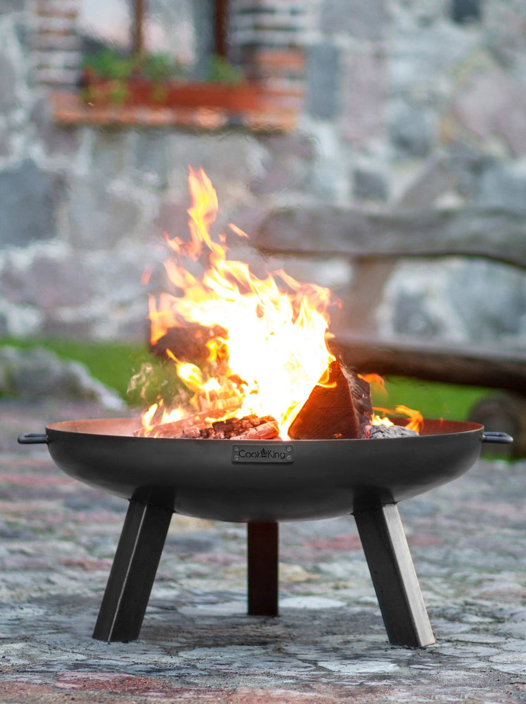 Eine schwarze Feuerschale steht auf einem gepflasterten Boden mit brennendem Feuer in der Mitte  umgeben von unscharfem Hintergrund mit Mauerwerk.