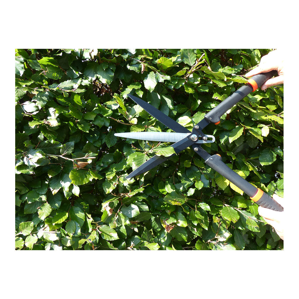 • Eine schwarze Heckenschere mit orangefarbenen Griffen ist geöffnet und zeigt ihre langen  scharfen Klingen.
