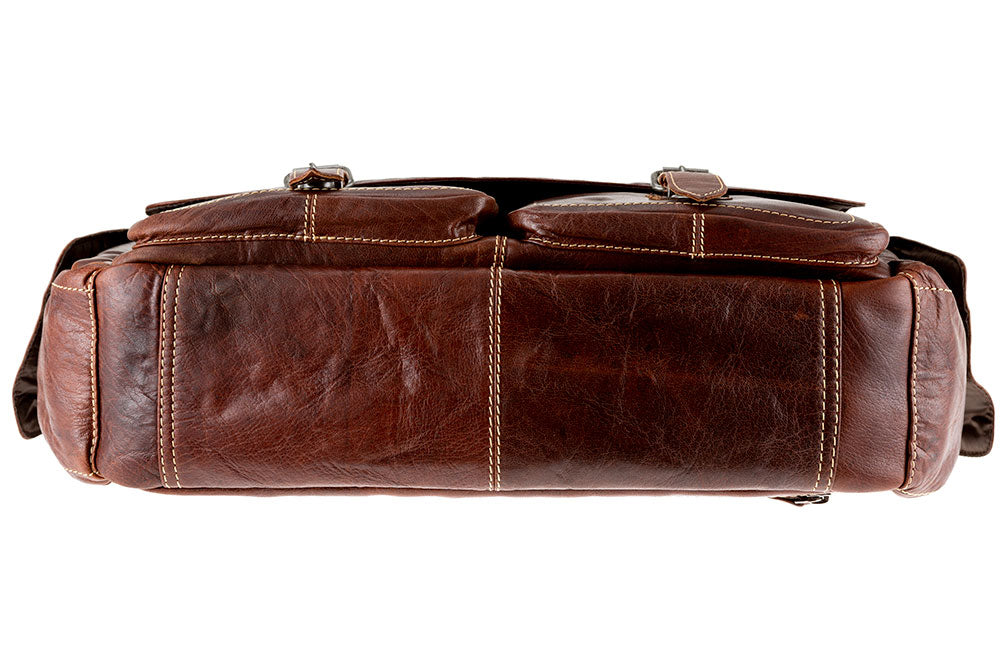 Dieser Artikel wird aus einem Stück Büffelleder gefertigt, allerdings handelt es sich bei der Farbe brandy um Büffelkalbsleder mit einer Stärke von etwa 1,8 mm, das an seiner Oberfläche mit einem Hartwachs von Hand poliert wird und dadurch einen Zwei-Ton-Effekt erhält. Durch diese Bearbeitung wird jeder Artikel zu einem Unikat. Die Metallteile an dieser Tasche sind nickelfrei.