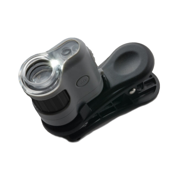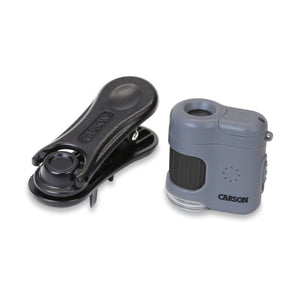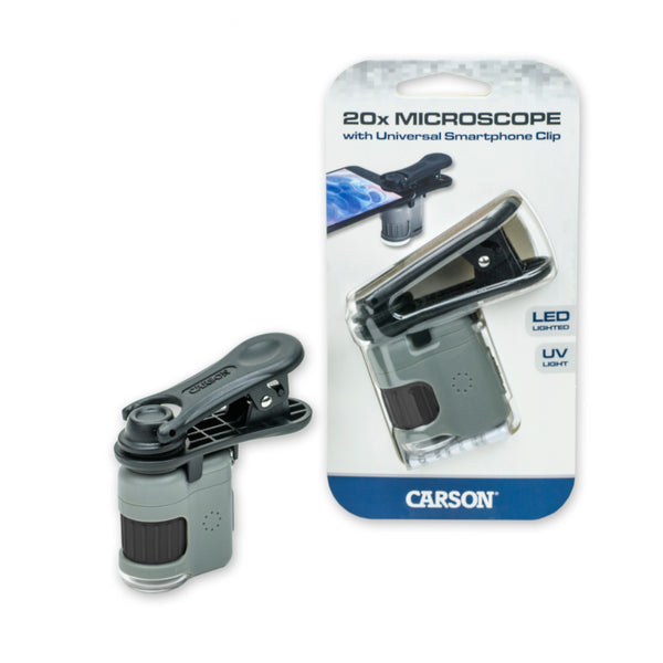 Mit dem MM-380 MicroMini bietet die Fa. Carson Optical ist ein äußerst leistungsstarkes Taschenmikroskop mit 20-facher Vergrößerung und einem praktischen Clip zur Befestigung des Mikroskops an einem Smartphone an. Der Befestigungsclip wird mit Hilfe von Magnetkraft am Mikroskop angebracht, wo er automatisch mit der im Clip befindlichen Kameraöffnung vermittelt wird. Befestigen Sie anschließend den Adapterclip ganz einfach an der Kamera Ihres Smartphones. Jetzt können Sie alle unter dem Mikroskop betrachteten Objekte ganz einfach fotografieren oder in einer Videosequenz festhalten und mit Ihren Freunden oder mit Ihrer ganzen Familie teilen.