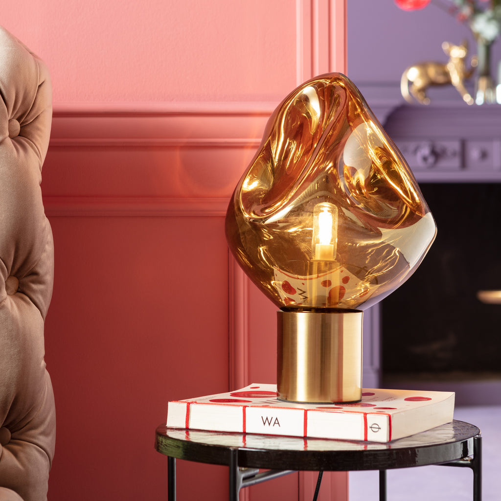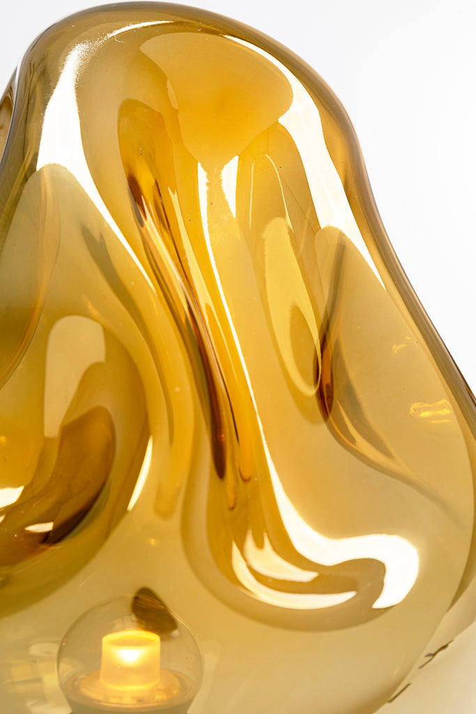 Die faszinierend schöne Tischlampe fängt den Moment ein, in dem eine Seifenblase in der Luft schwebend ihre Form ändert. Aus dem organisch geformten Lampenschirm verbreitet sich golden schimmerndes Licht vom Nachttisch oder einem Sideboard aus. Trotz ihres glamourösen Erscheinungsbilds wirkt die Designer-Leuchte verspielt und leicht.