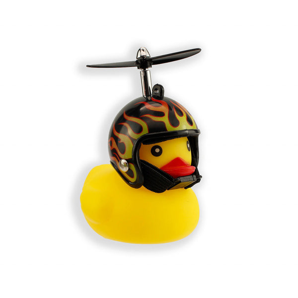 Gelbes Quietsche-Entchen mit einem Helm mit Flammen und Propeller oben drauf, perfekt zur Befestigung am Fahrrad mit einer Fahrradhalterung. Eine witzige Variante des klassischen Fahrradhupens vor einem sauberen weißen Hintergrund.
