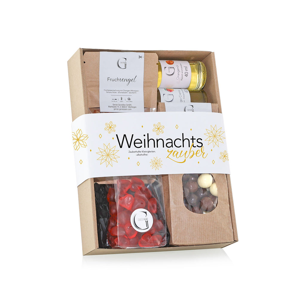 • Eine Geschenkbox mit der Aufschrift "Weihnachtszauber" enthält verschiedene Leckereien  darunter eine Flasche  eine Packung Gummibärchen und Schokoladendragees  schön verpackt in einem Karton mit festlichem Design.