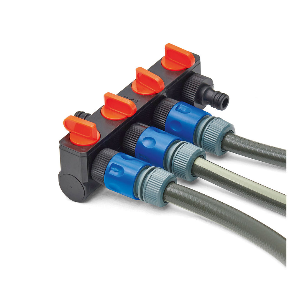 Ein regulierbarer 4-Wege-Verteiler mit Schlauchanschluss-Set ist im Lieferumfang enthalten und lässt sich mit gängigen Gartenschläuchen in Deutschland verbinden. Damit lassen sich die einzelnen Wasserelemente gezielt an- und abstellen – ganz nach Lust und Laune.