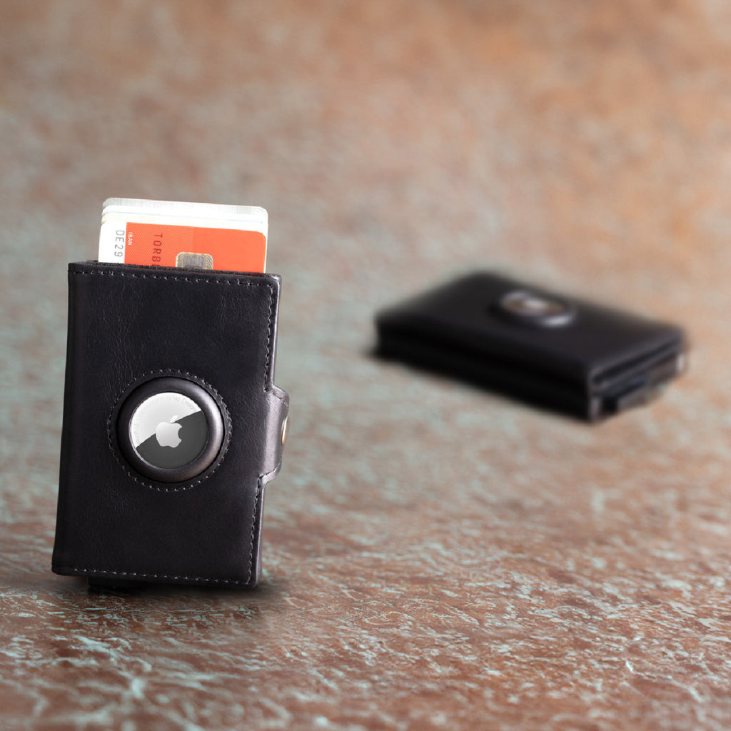 Kartenetui mit Aussparung für APPLE AirTag®, Kartenfach passend für bis zu 7 Karten mit Schiebemechanismus, Schlüsselfach, Banknotenfach, verschließbar mit Druckknopf, Ausleseschutz (RFID)