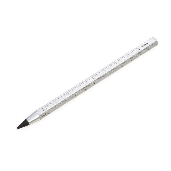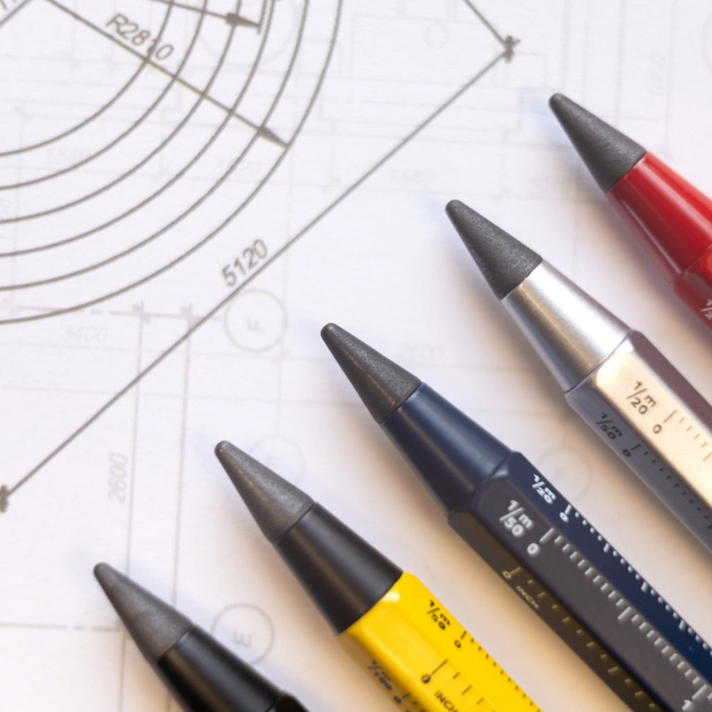Bleistift-Technik neu definiert. Nie mehr Anspitzen, nie mehr abgebrochene Minen, statt dessen: nachhaltige Endlosschreibspitze in HB für bis zu 20 km Schreiblänge, austauschbar, radierbar und unzerbrechlich. Im typischen CONSTRUCTION-Look mit Zentimeter-/Zoll-Lineal und 1:20- und 1:50-Skala.