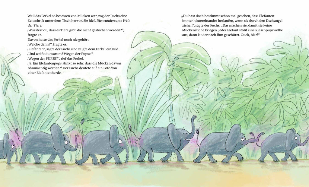 Das Ferkel ist außer sich. Kaum will es einen lauschigen Abend im Wald genießen, wird es von einer lästigen Mücke gestochen! Da helfen nur Elefantenpupse, weiß der Fuchs, denn deren Gestank hält keine Mücke aus. Nur leider sind die viel zu teuer, und normales Mückenspray taugt nichts. Glücklicherweise hat der Fuchs lauter abgelaufene Sachen im Kühlschrank, aus denen sich die beiden ihr eigenes Stinkespray mixen. Und es funktioniert perfekt!