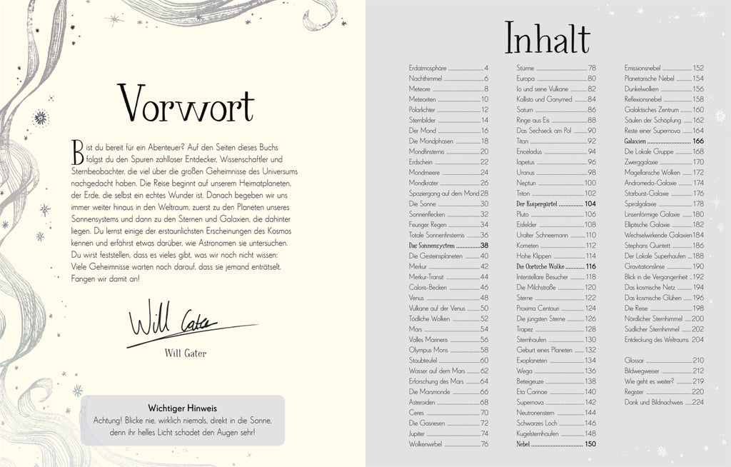 - Über 100 Einblicke in das Weltall für Kinder - von unserem Heimatplaneten Erde aus geht es am Mond vorbei zu den Planeten des Sonnensystems bis zum Kuipergürtel und seinen Himmelskörpern. Im interstellaren Raum fliegt man weiter zu leuchtenden Sternen, bunten Nebeln und fernen Galaxien.