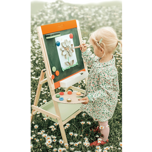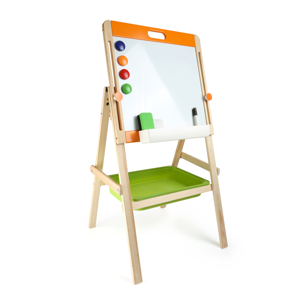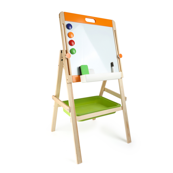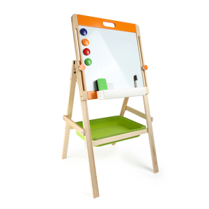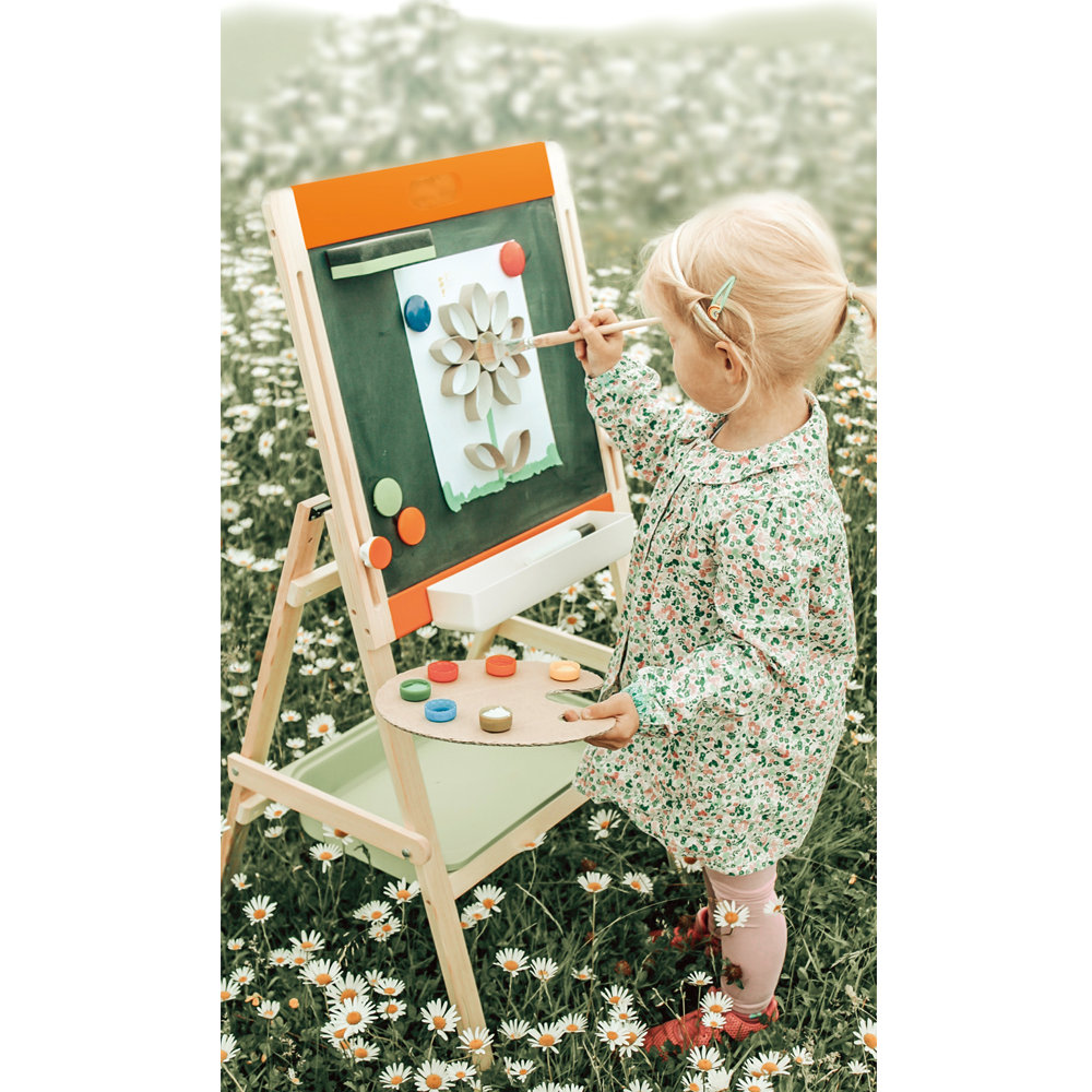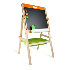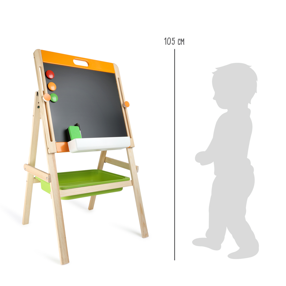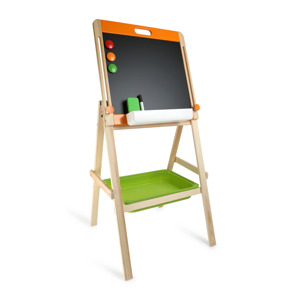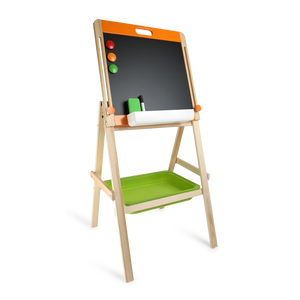 Diese Schreibtafel lässt sich mit Kreide und Filzstift auf den beiden verschiedenen Untergründen bemalen. Auch Magnete hält sie fest. Als Aufbewahrungsmöglichkeit dient die grüne Box die eingehängt werden kann. Beim Aufstellen helfen die Abstandshalter der Standfüße für einen stabilen Halt. Schwamm, Kreide, Filzstift und vier Magnete werden mitgeliefert.