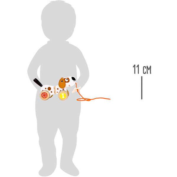 Wuff, Wuff! Diesen niedlichen Hund können die Kleinsten hinter sich herziehen. Durch die Gummiringe an den Reifen ist er sehr geräuscharm. Er wackelt mit Ohren und Rute und macht in jeder Kurve eine gute Figur. Den Knochen an der Leine gibt es als Belohnung.