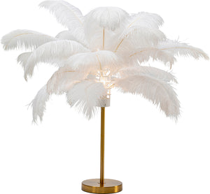 Diese Tischleuchte ist für Romantiker und Träumer designt. Der Lampenschirm aus echten, weißen Straußenfedern umspielt mit sanften Bewegungen die Lichtquelle, deren Schein sich verspielt an den Federn bricht. Wenn Sie gerade Urlaubs-Feeling verspüren, erkennen Sie vielleicht sogar eine Palme in der Designer-Leuchte. Gut kommt das Schmuckstück aus edel mit Messing beschichtetem Metall und Federn neben Ihrem Sofa oder auf dem Nachttisch zur Geltung.