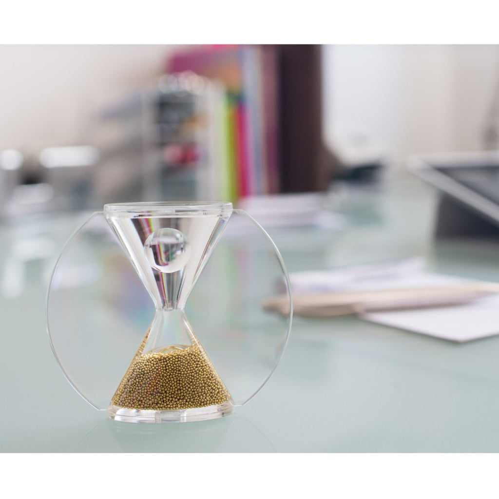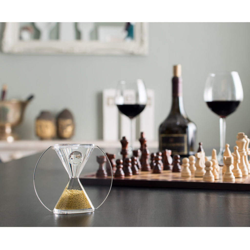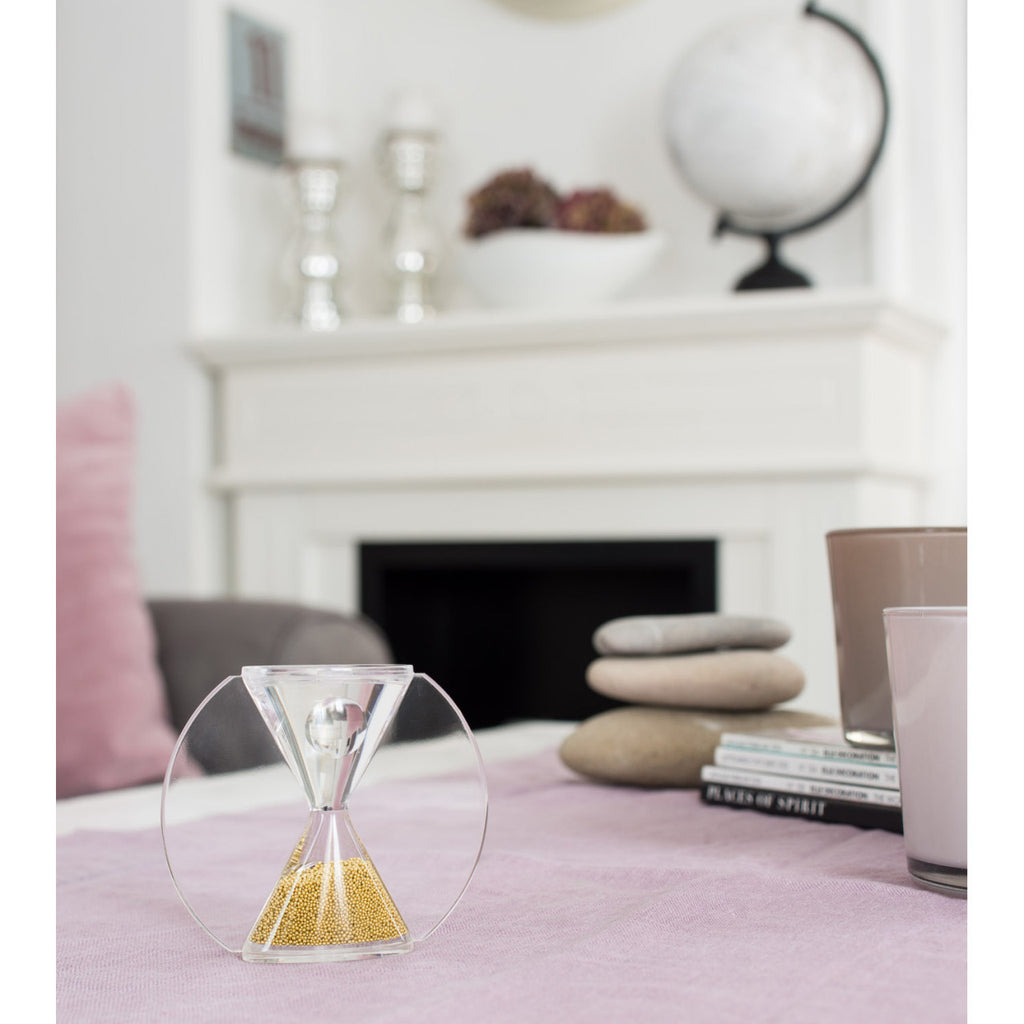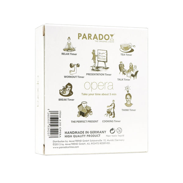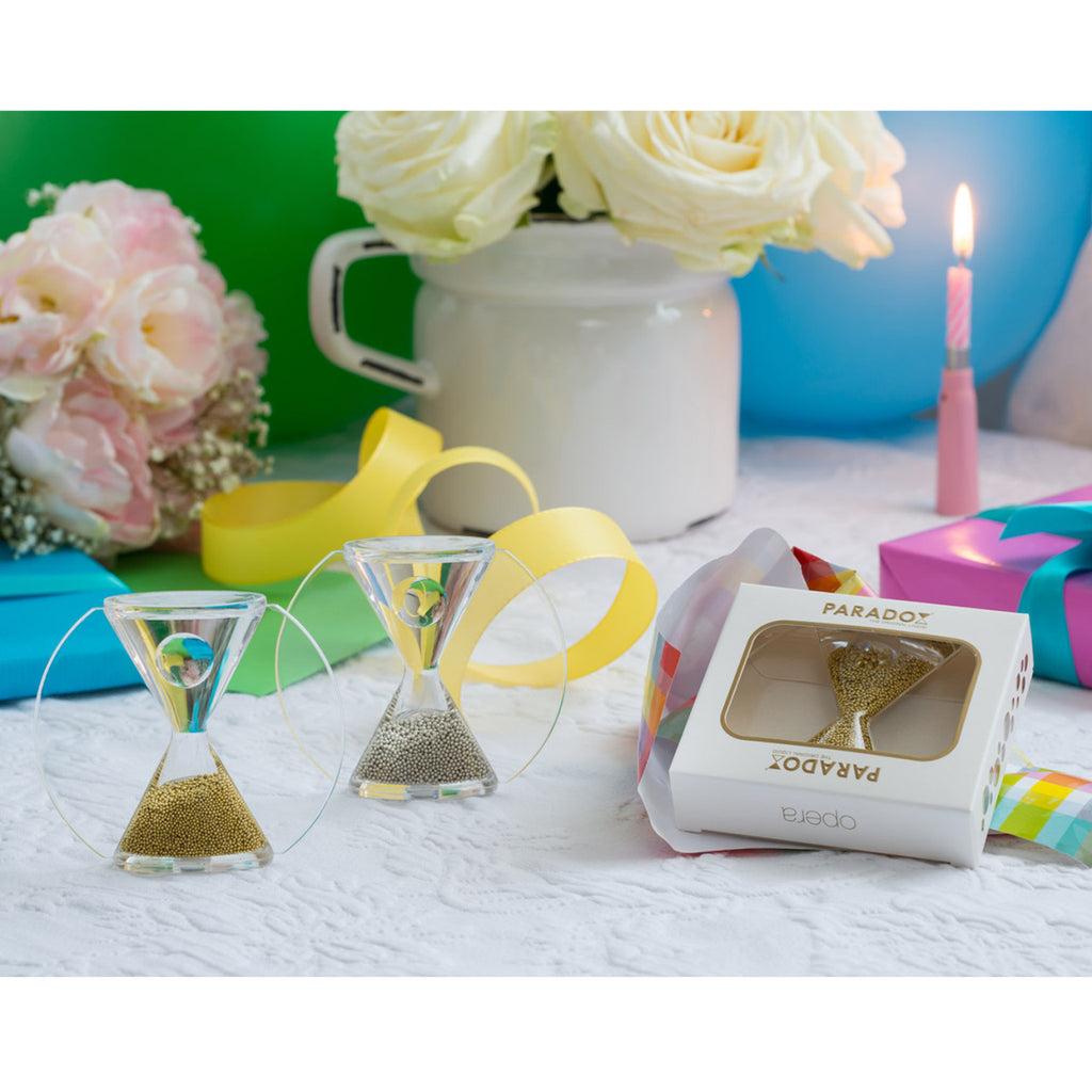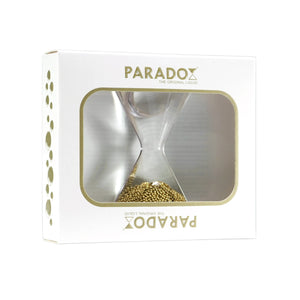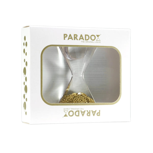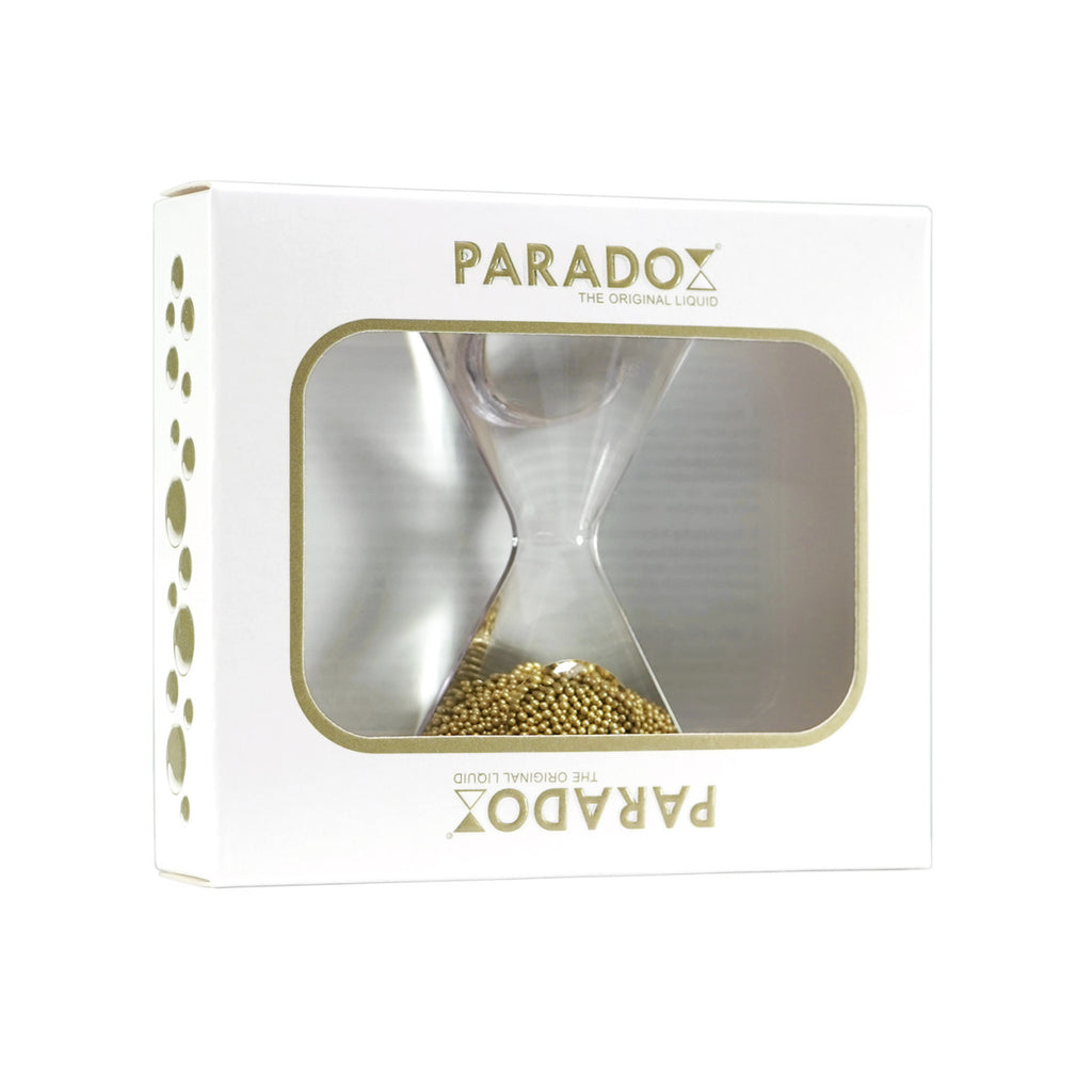 Diese PARADOX Sanduhr läuft zwar nicht gegen die Zeit wie die anderen Modelle, sondern von oben nach unten; dafür sind die schwereren Glasperlen "Gold wert" und fließen flotter als die vergleichbare Sanduhr Paradox
