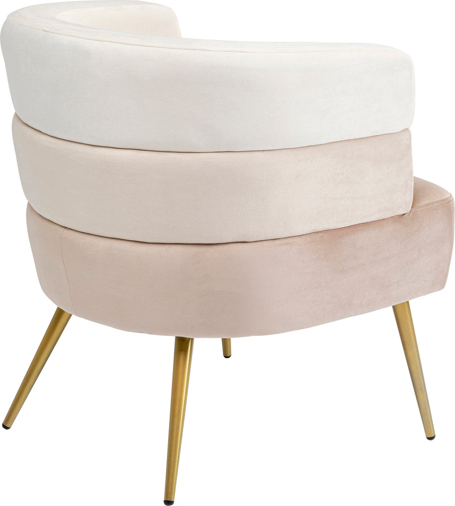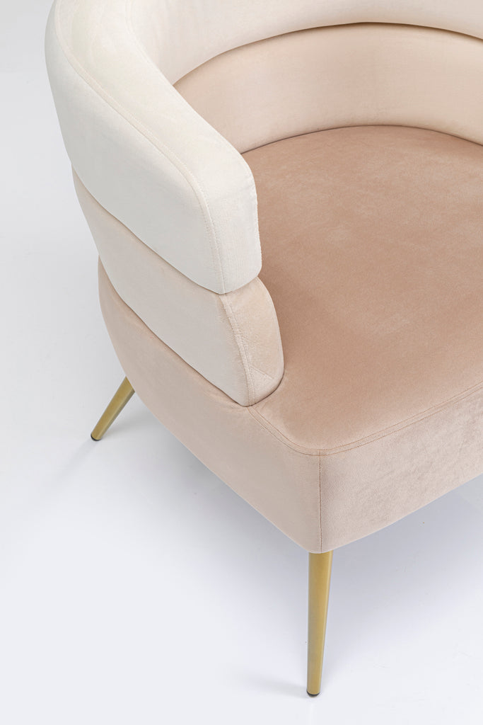 Auf diesem Sesselchen sitzen Sie wie auf einem samtigen Thron in Creme und Gold. Die drei abgestuften Cremetöne der samtigen Polster und die zweigeteilte Rückenlehne sorgen für einen hohen Designfaktor. Seine durchgehende, halbrunde Arm- und Rückenlehne macht ihn supergemütlich. Dieser attraktive Cocktail-Sessel passt perfekt in jede Einrichtung, findet in der Leseecke Platz oder steht dank seiner besonderen Optik für sich allein.