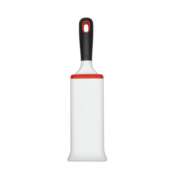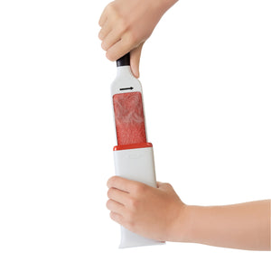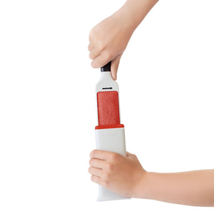 • Eine Person schiebt eine rote Fusselbürste in ihre weiße, selbstreinigende Basis, um Tierhaare zu entfernen und die Bürste makellos zu halten.