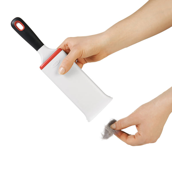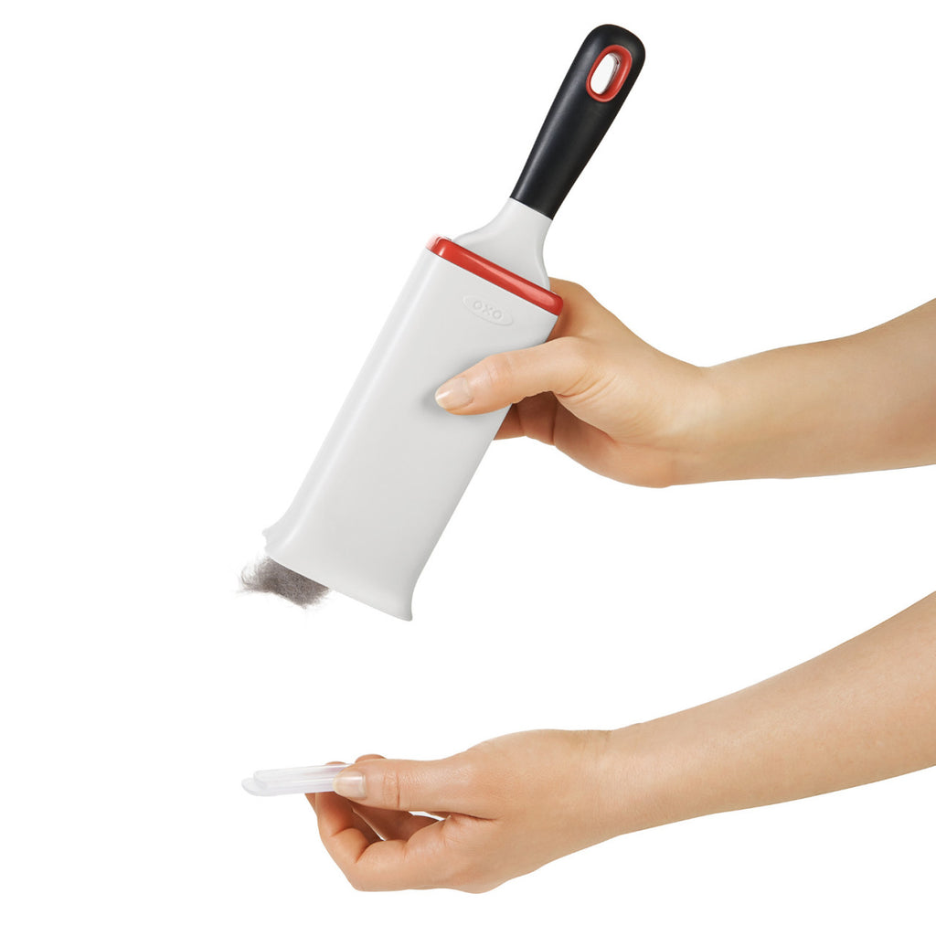 • Eine Hand entfernt Flusen von einer weißen Fusselbürste, die von einer anderen Hand gehalten wird, wodurch Tierhaare dank ihrer selbstreinigenden Basis leicht entfernt werden können.