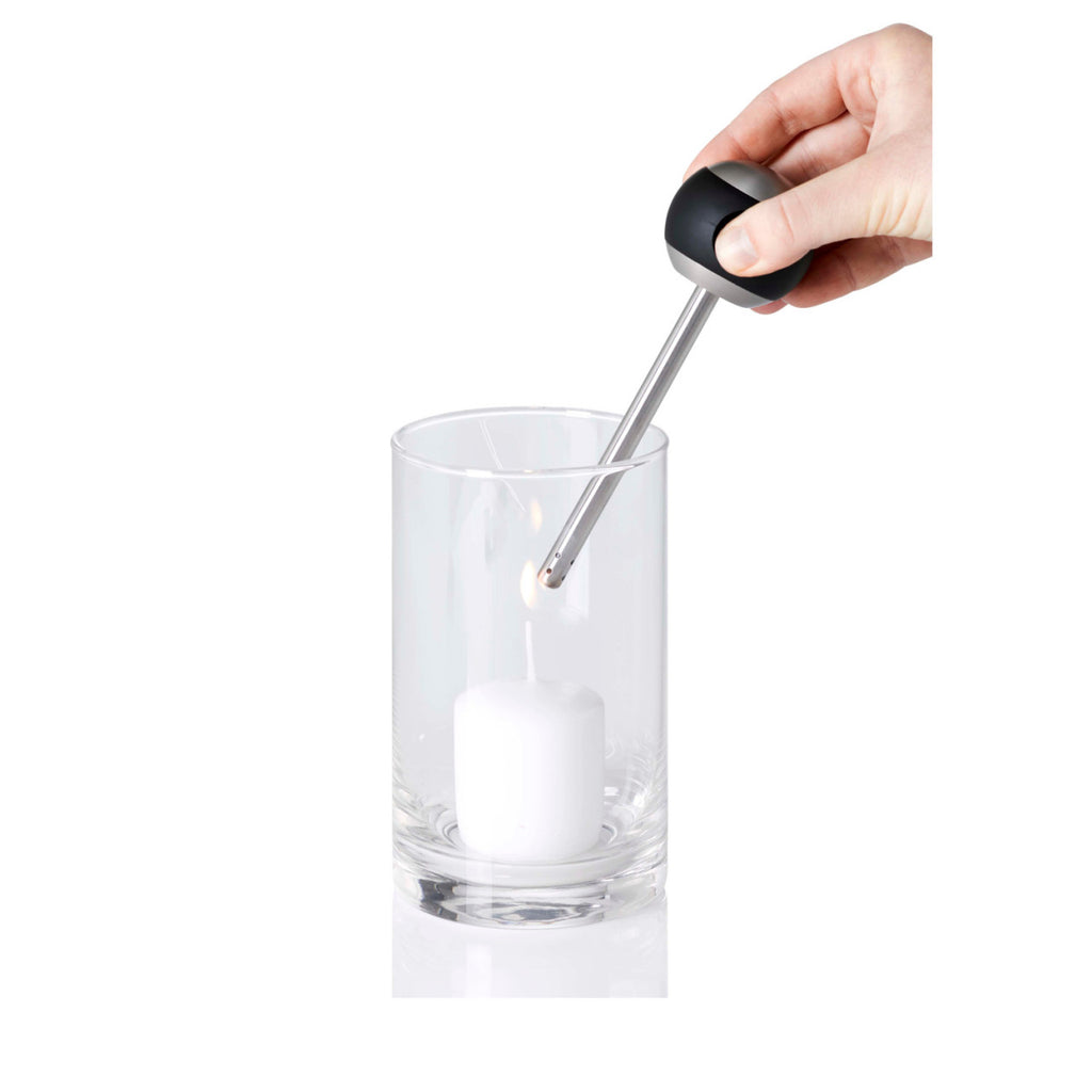 • Silbernes und schwarzes Tischfeuerzeug mit rundem Fuß und langem, schlankem Metallstab, ausgestattet mit Piezozündung, dargestellt vor weißem Hintergrund.