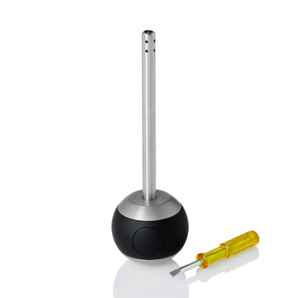 Ein metallenes, schwarzes, kugelförmiges Tischfeuerzeug mit Piezozündung und senkrechtem Stab, daneben ein Schlitzschraubendreher mit gelbem Griff.