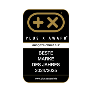 Plus X Award-Logo mit deutschem Text: „Beste Marke des Jahres 2024/2025“ auf einem schwarz-goldenen Abzeichen, ideal für Ihr wiederbefüllbares Tischfeuerzeug mit zuverlässiger Piezozündung.