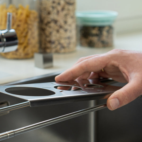 Der ausziehbare Küchenhelfer passt über jede Spüle und bietet Lappen und Co. einen hygienischen Ort zum Lagern und Trocknen.