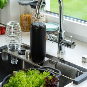 Diversen „Abtropfszenarien“ bietet Drip.it die ideale Lösung. Der Edelstahleinsatz macht sie zur perfekten mobilen und leicht verstaubaren Abtropfstation für fast alle wiederverwendbaren Flaschenarten. Egal ob Glasflaschen, moderne Thermoflaschen oder Babyflaschen. Auch den frisch gewaschenen Salat oder die gekochte Pasta kann man mithilfe von Drip.it ganz einfach im Sieb abtropfen.