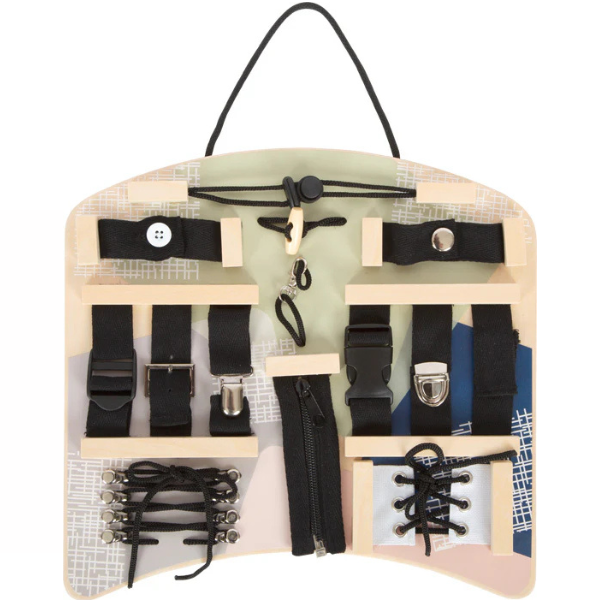 14-fachen Spiel- und Motorikspaß bietet dieses Lernbrett aus Holz, das mit Verschlüssen unterschiedlicher Ausführungen ausgestattet ist. Das Spielbrett in modernen Trendfarben und mit hohem sichtbaren Holzanteil eröffnet Kleinkindern eine Fülle an Spiel- und Beschäftigungsmöglichkeiten zur Förderung der feinmotorischen Fähigkeiten. Von Knebelknopf mit Schlinge über Gürtelschnalle, Klettverschluss und Hosenträgerklemme bis hin zu Reiß- und Klickverschluss, bietet dieses Aktivitätsboard eine Vielzahl an Verschlussmöglichkeiten, die Kinder aus ihrem Alltag kennen und die spielerisch geübt werden können. Mit Schnürsenkeln zum Üben des Einfädelns und Schleifebindens.