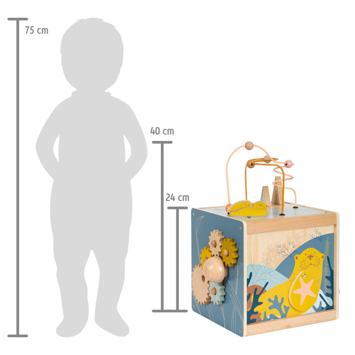 Der Motorikwürfel „Seaside“ überzeugt mit einer Kombination aus viel naturbelassenem Holz und sanften Trendfarben und sorgt mit abgerundeten Kanten für eine angenehme Haptik. Das Multitalent in punkto Spielen, Lernen und Entdecken trainiert die Wahrnehmung, fördert Geschicklichkeit und Feinmotorik, verbessert die Hand-Augen-Koordination und regt die Fantasie an. Ideal zu ergänzen durch weiteres Babyspielzeug der Produktlinie „Seaside“.