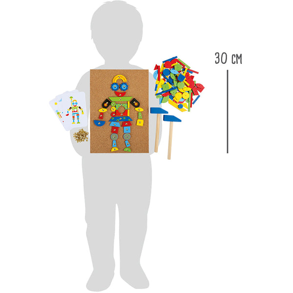 Hör mal wer da hämmert! Ein elastisches Korkbrett, zwei kleine Holzhämmerchen, 100 kleine Nägel und 126 kunterbunte Holzteile geben den Startschuss um ein individuelles Bild zu gestalten. Mit 6 Bildvorlagen und Aufbewahrungsbox! Hier sind der Fantasie keine Grenzen gesetzt. Ob Roboter, Zug oder Rakete hier ist alles möglich. Wer noch Ideen sucht, schnappt sich einfach die sechs Bildvorschläge und los geht’s!