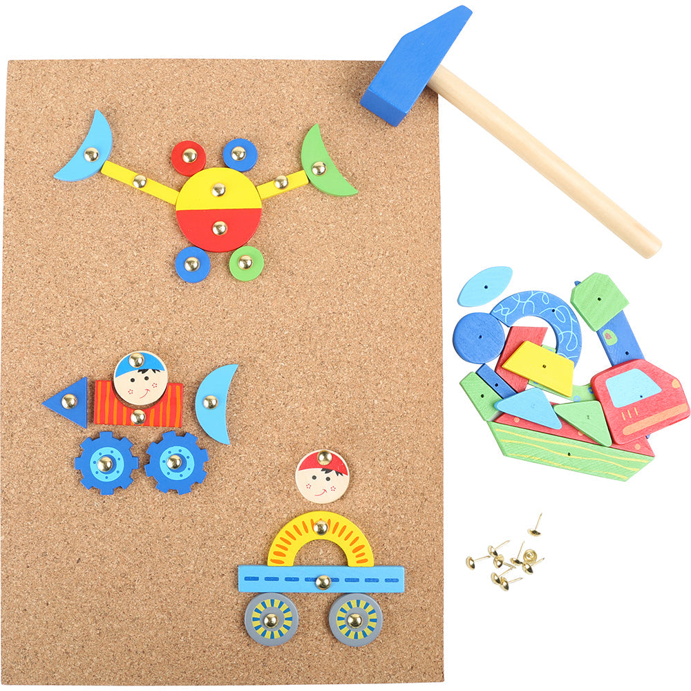- umfangreiches Set bestehend aus 100 Ziernägeln, 126 Holzelementen, Korkbrett und Holzhammer
