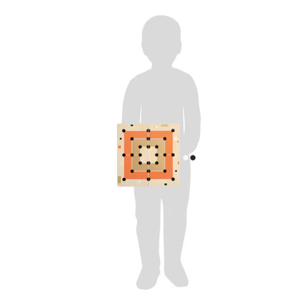 • Silhouette eines Kindes, das ein 28 x 28 x 2,5 cm großes 2-in-1-Spielbrett hält, die Körpergröße des Kindes ist mit 120 cm angegeben.