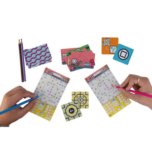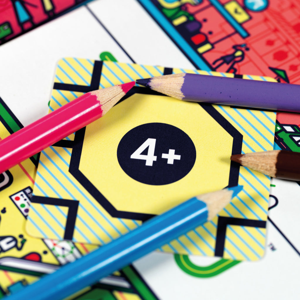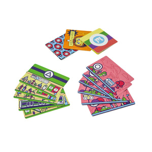 Inhalt: 100 doppelseitige Stadtpläne, 4 Buntstifte, 11 Stationskarten, 5 Karten "Gemeinsames Ziel", 4 Effektkarten, 4 Symbolkarten, 1 Anleitung