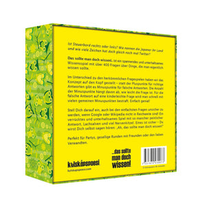 Ein Spiel über Dinge, über die man eigentlich Bescheid wissen sollte. Ist Steuerbord rechts oder links? Wie nennen die Japaner ihr Land und wie viele Zeichen hat doch gleich noch mal Twitter? Das sollte man doch wissen! ist ein spannendes und unterhaltsames Wissensspiel mit über 400 Fragen über Dinge, die man eigentlich wissen sollte.