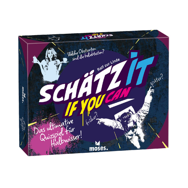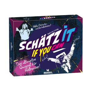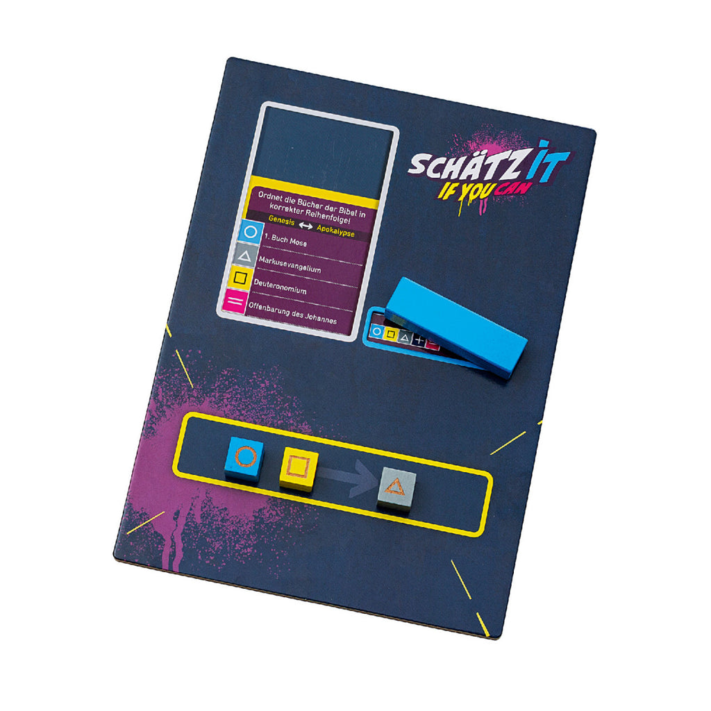 Dieses Spiel vereint außergewöhnliche Quizfragen mit Halbwissen und Bluffen. Denn bei „Schätz it – if you can“ gewinnt nicht, wer am meisten weiß, sondern wer am besten blufft. Spieler*innen, die am Zug sind, decken die Begriffe in der richtigen Reihenfolge auf. Der*die nächste Spieler*in bringt die Begriffe entweder in die richtige Reihenfolge oder segnet die Reihenfolge ab und deckt einen weiteren Begriff auf. Bei Anzweiflung werden die Antworten direkt kontrolliert.