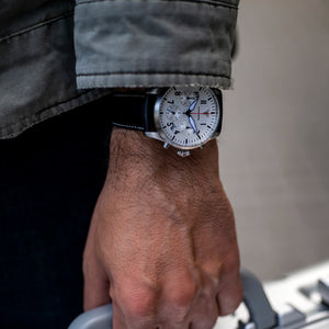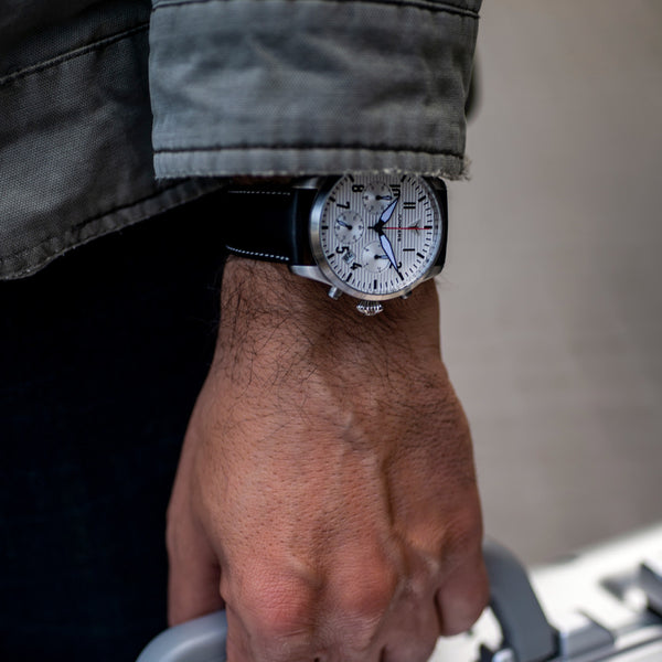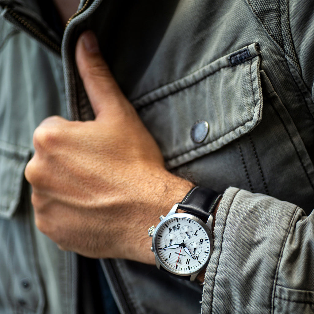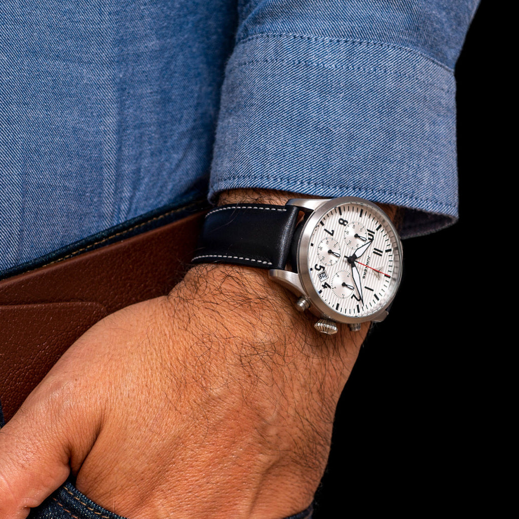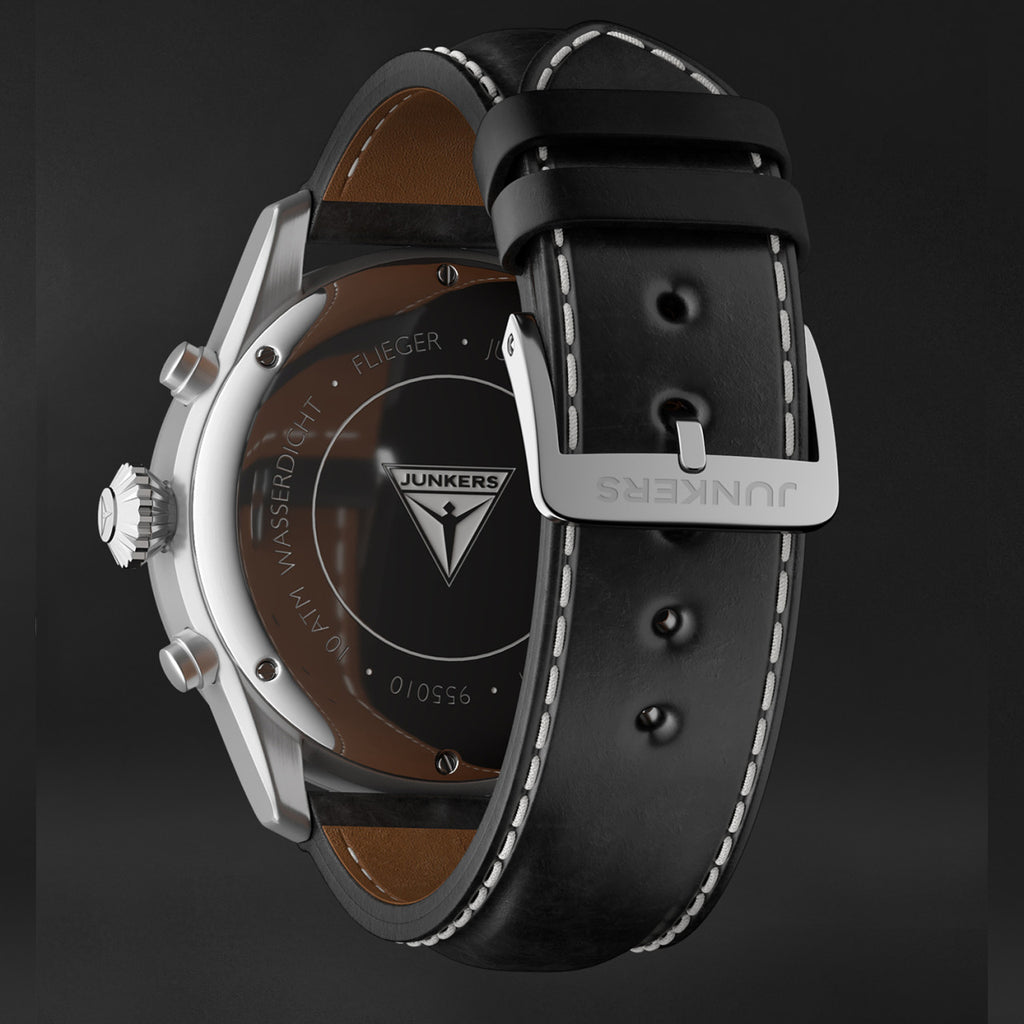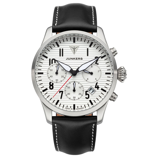 Der Junkers Flieger Chronograph mit dem einzigartigen Wellblech der Junkers-Flugzeuge ist die klassische Fliegeruhr für stilbewusste Abenteurer. Junkers Fliegeruhren bieten durch die leuchtenden Zeiger und Indizes exzellente Ablesbarkeit bei Tag und Nacht. Das dreieckige Logo bei 12 Uhr, die großzügige Krone und die Form der Zeiger verleihen ihnen den typischen Flieger-Look und lassen die Ära der Anfänge der Fliegerei am Handgelenk wieder aufleben.