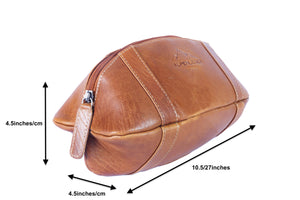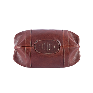 • Eine braune Büffelleder-Kulturtasche mit sichtbaren Nähten, abgebildet vor weißem Hintergrund.