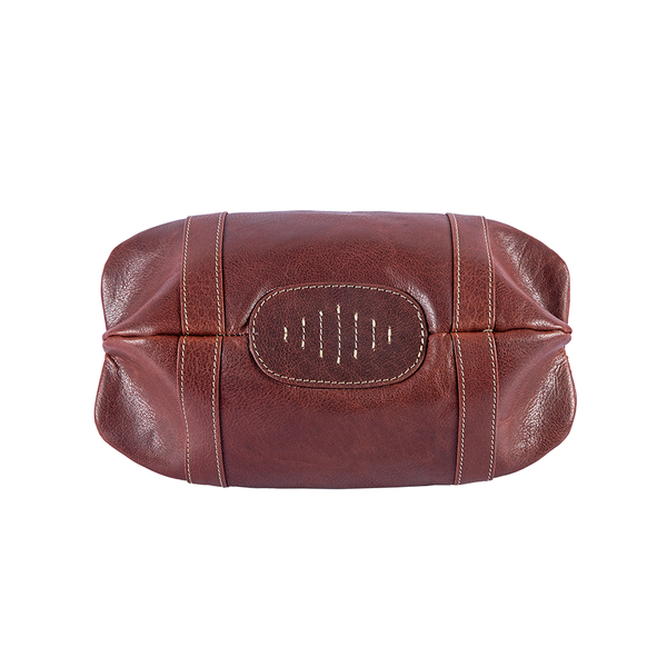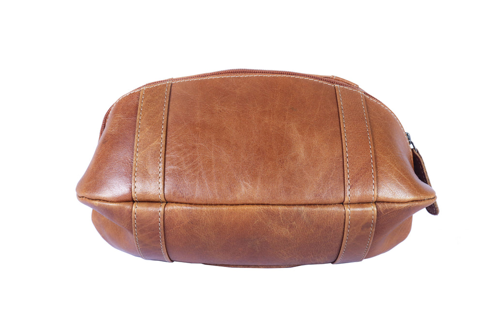 • Braune Büffelleder-Kulturtasche von unten mit sichtbaren Nähten und zwei parallelen Lederstreifen.
