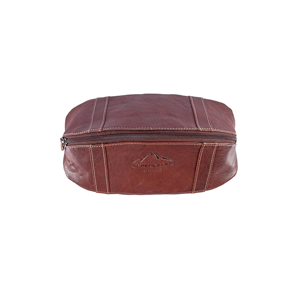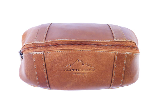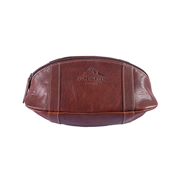 Braune Kulturtasche aus hochwertigem Büffelleder mit weißen Nähten und Reißverschluss, mit dem Alpenleder-Logo auf der Vorderseite.