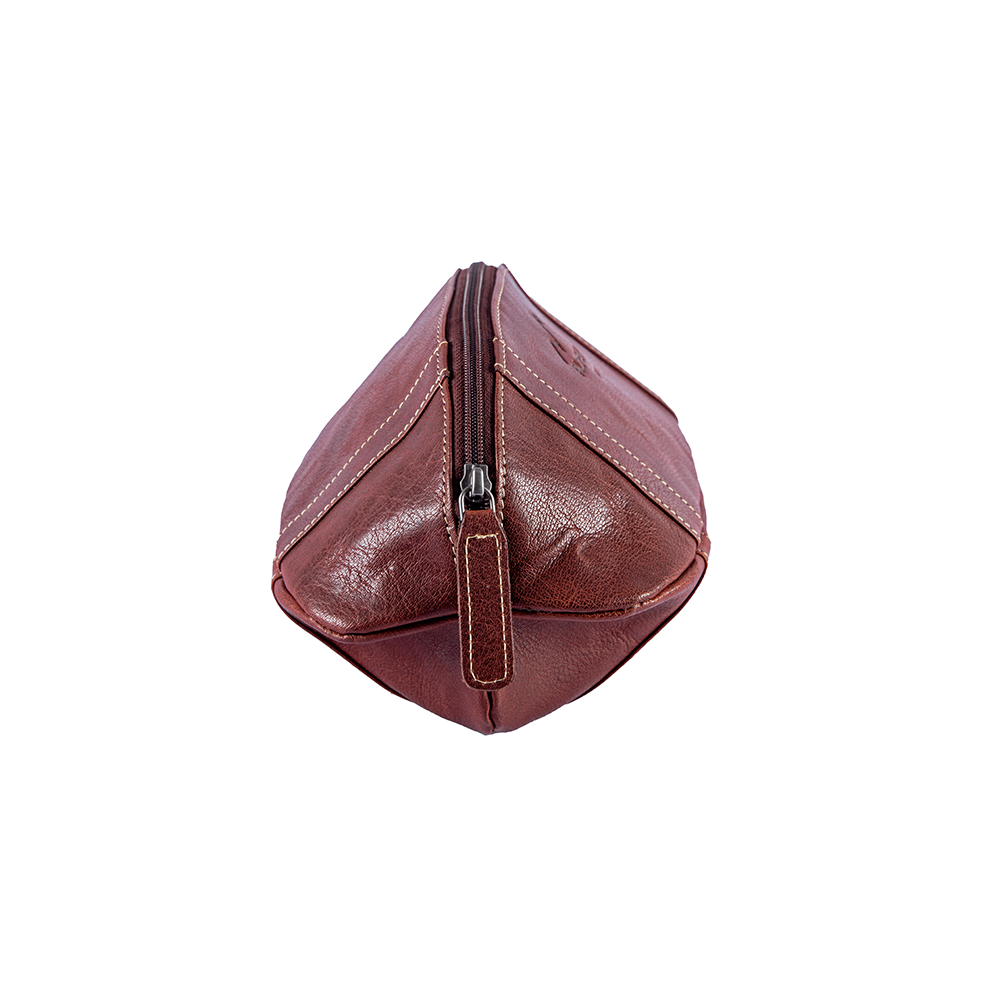 • Braune Kulturtasche aus Büffelleder mit Reißverschluss von der Seite mit sichtbaren Nähten auf weißem Hintergrund.