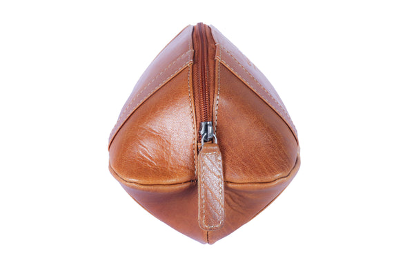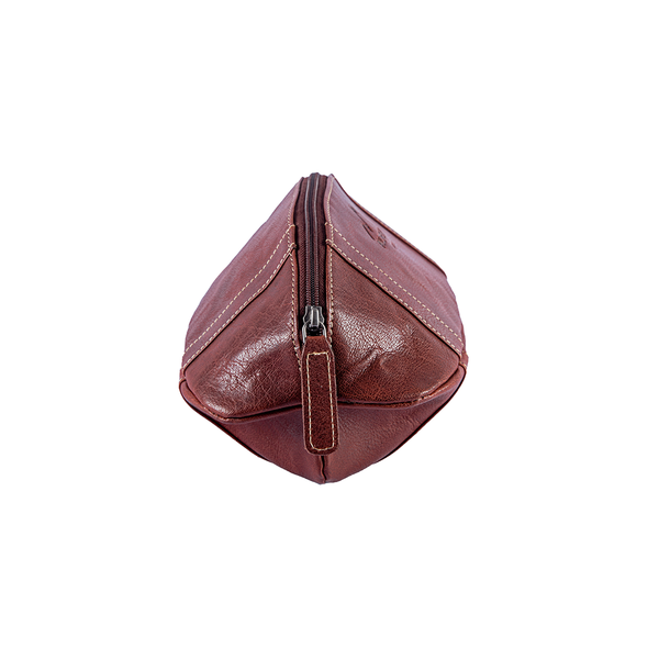 Braune Kulturtasche aus Büffelleder mit Reißverschluss von der Seite mit sichtbaren Nähten auf weißem Hintergrund.