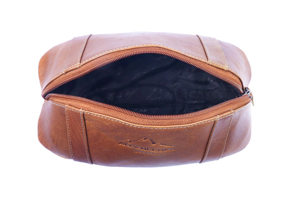 Draufsicht einer offenen Kulturtasche aus braunem Büffelleder mit sichtbarem Reißverschluss und leerem Innenraum.