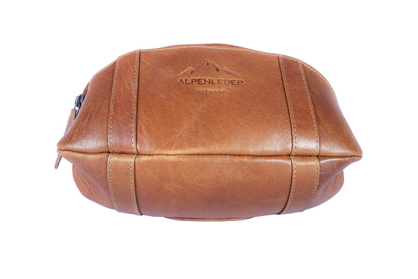 Braune Büffelleder-Kulturtasche mit Alpenleder Germany-Prägung auf der Vorderseite, abgebildet auf weißem Hintergrund.