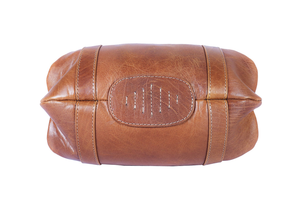 Braune Büffelledertasche von unten betrachtet, mit Nähten und Säumen auf weißem Hintergrund – eine robuste Kulturtasche, perfekt für den täglichen Gebrauch.