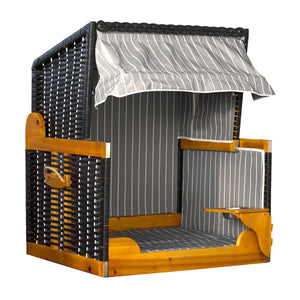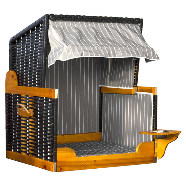 Der Hundestrandkorb ist aus hochwertigem Wachholderholz gefertigt und vermittelt dank der hervortretenden Maserung rustikale Gemütlichkeit. Ein witterungs- und UV-beständiges PE-Geflecht rahmt den Strandkorb auf formschöne Weise ein. Es macht den Hundestrandkorb zu einem langlebigen und wetterbeständigen Accessoire, das auch im Freien viele Jahre lang seine edle Optik behält. Das optisch abgesetzte Dach des Hundestrandkorbs ist dem unserer klassischen Strandkörbe nachempfunden. In Kombination mit der luftigen Markise im maritimen Dessin entsteht ein hundefreundliches Pendant, das einem richtigen Strandkorb optisch in nichts nachsteht.