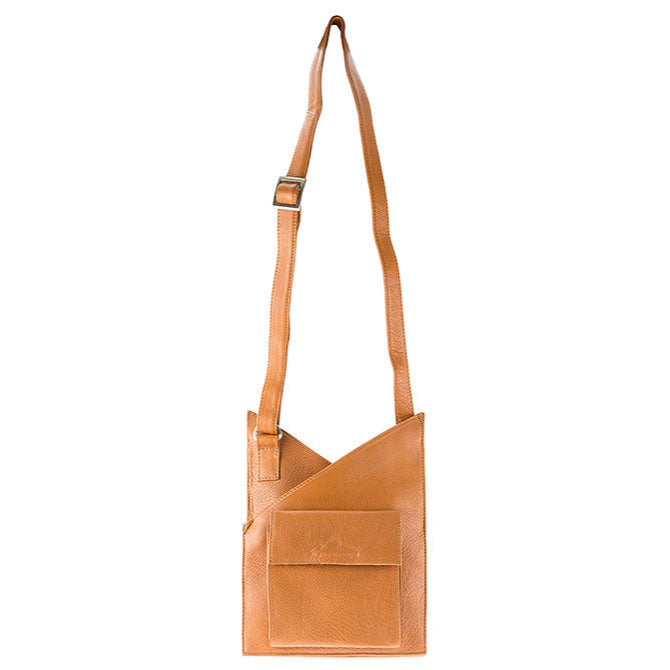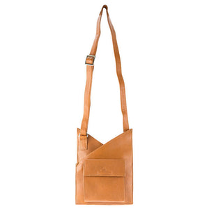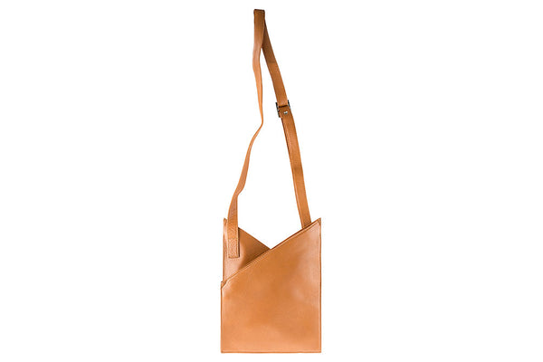 Tan Leder-Umhängetasche mit asymmetrischem, eckigem Design, verstellbarem Riemen und praktischem Reißverschluss auf weißem Hintergrund.