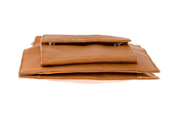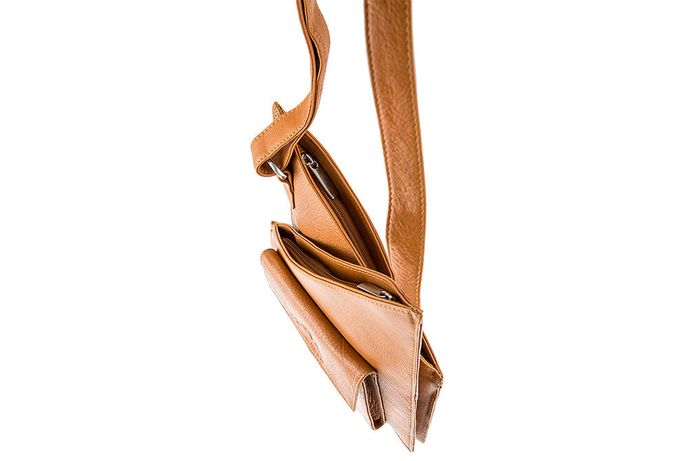 • Hellbraune Leder-Umhängetasche mit zwei Reißverschlussfächern, fotografiert vor weißem Hintergrund.