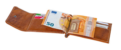 • Eine braune Umhängetasche aus Leder mit Druckknöpfen, flach auf weißem Hintergrund liegend.